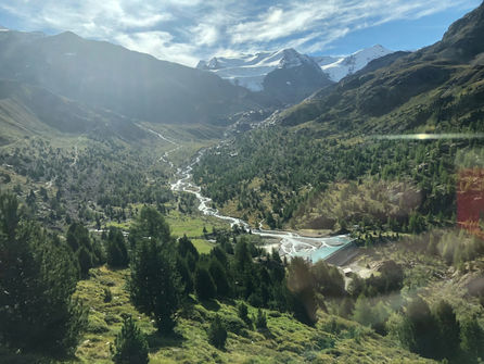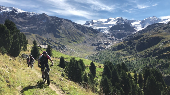 Wir haben derweil Zeit, bei aller Schaukelei die Aussicht auf die umliegenden Gletscher zu genießen. Am Rifugio belohnen wir unser Nichtstun mit einem Cappucino bevor es in den Panoramatrail geht. Der verdient seinen Namen zu Recht, mehr Aussicht geht nicht. Auf der Alpe lassen wir dann mit Polenta, Käse- und Wurstplatte in der Sonne verwöhnen. Dolce vita. Danach Feldwegserpentinen bis herunter in den Ort.